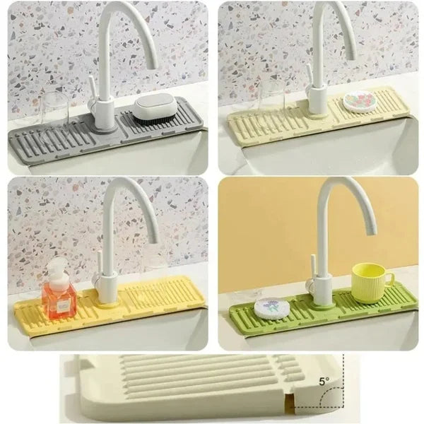 Simplify your kitchen cleanup routine and keep your sink area dry & organized with the Faucet Splash Guard Draining Tray Mat.