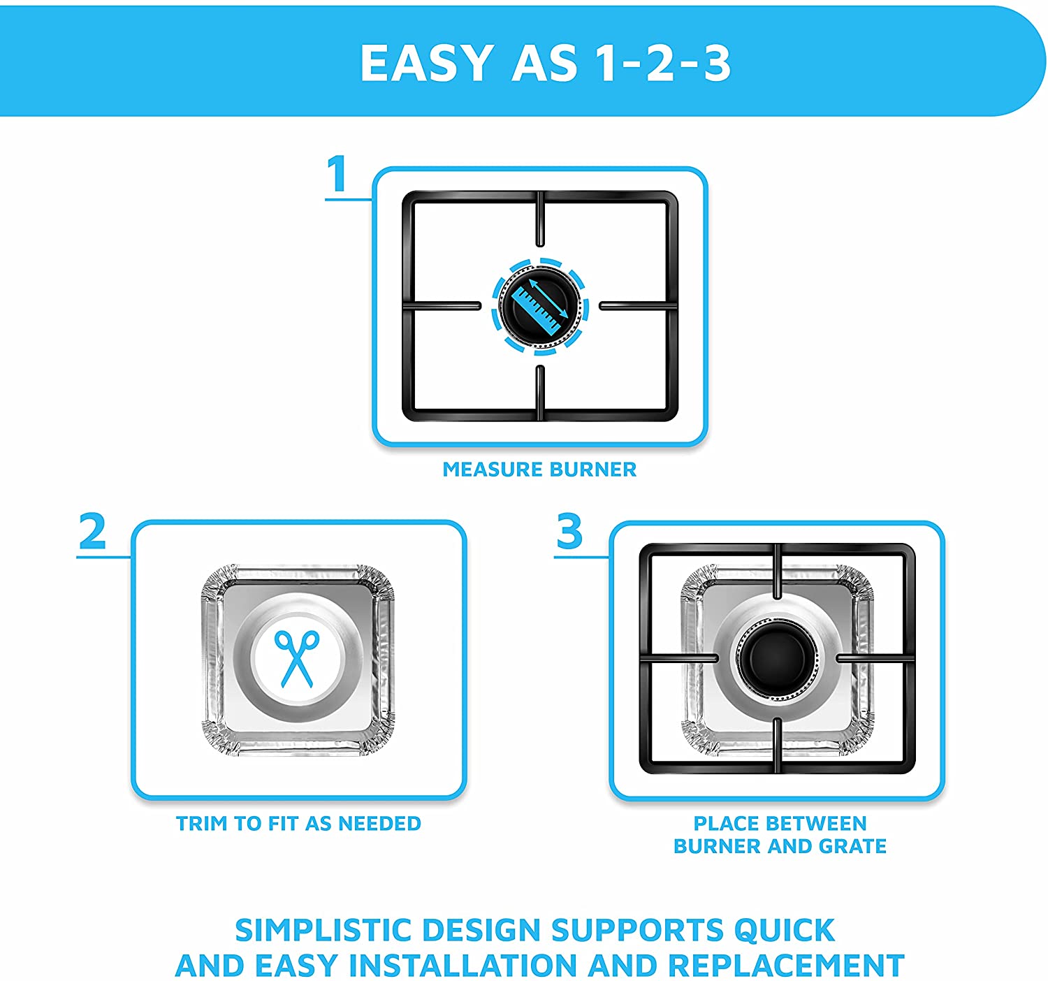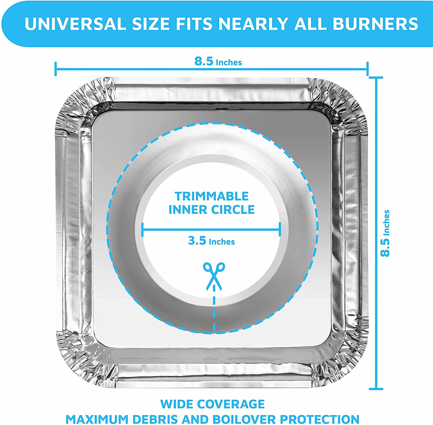 - STANDARD SIZING THAT’S WILLING TO FLEX: Our square stovetop covers measure 8 ½” on each side and 3 ½” at the center opening, which is compatible with most stoves. Flexible foil may be custom adapted to fit separate and continuous grates.
