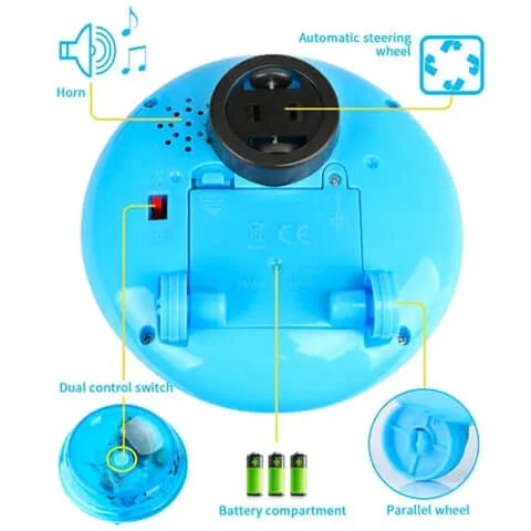 Spray Water Baby Bath Toy can automatically spray water and flashlights, bringing endless entertainment for baby bath. It can be turned into a Space UFO toy after being placed on the base, singing, and driving in Omni-directions.