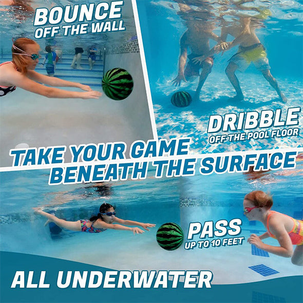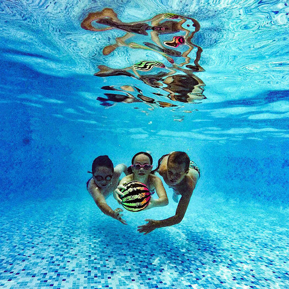 FUN UNIQUE SWIMMING POOL BALLS ideal for water and dive games in the pool, lake, or pond. Players can dribble, kick, bounce, and pass the Watermelon Ball 10 ft underwater and the Watermelon Ball JR 8 ft due to its near neutral buoyancy! The ball stays under the water unlike a volleyball or other types of water ball or inflatables.