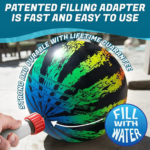 Watermelon Ball is a water-filled ball that mimics the flotation of a watermelon. The ball will sink then slowly rise to the surface when thrown in water. The ball can also be bounced, dribbled and passed underwater making it great for all sorts of water games. The Watermelon Ball comes with a hose adapter and filling needle to fill with water.